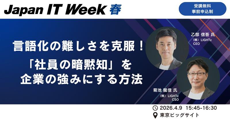 株式会社LIGHTz(本社:茨城県つくば市、代表取締役社長CEO:乙部 信吾、以下LIGHTz)は、2026年4月9日(木)に開催されるJapan IT Week 春において、代表取締役社長CEO 乙部信吾及び、執行役員CSO菊池 龍信が「言語化の難しさを克服!『社員の暗黙知』を企業の強みにする方法」と題したセミナーに登壇することをお知らせします。