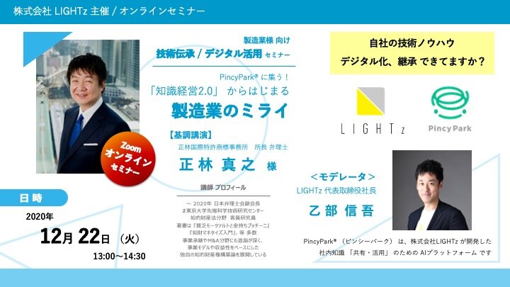 “自社の技術ノウハウ デジタル化、継承できてますか?” LIGHTzは製造業者様向け技術伝承/デジタル活用WEBセミナー ”PincyPark®に集う!「知識経営2.0」からはじまる「製造業のミライ」” を開催致しました